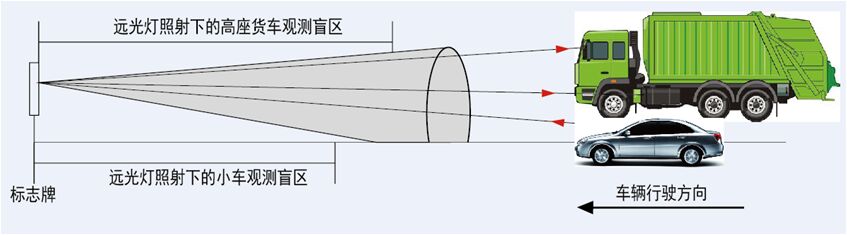 逆反射標志在遠光燈照射下,由于光的衍射性能,在反射時會形成以核心亮、外圍暗為特征的三角光錐。在“回光三角錐”的邊緣或外側(cè),根本無法準確視認標志。這可以解釋,高座貨車即使開啟遠光燈,所看到的標志內(nèi)容也較普通轎車更為昏暗。