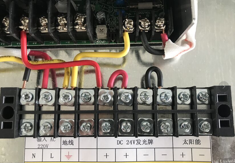 3、半透發(fā)光標志上的電線接入控制箱內(nèi)的低壓DC-24V輸出端子,本次標志正極為棕色線;負極為藍色線。外接電源線接入高壓輸入端子。地線必須接地,導(dǎo)入地面土壤內(nèi)。