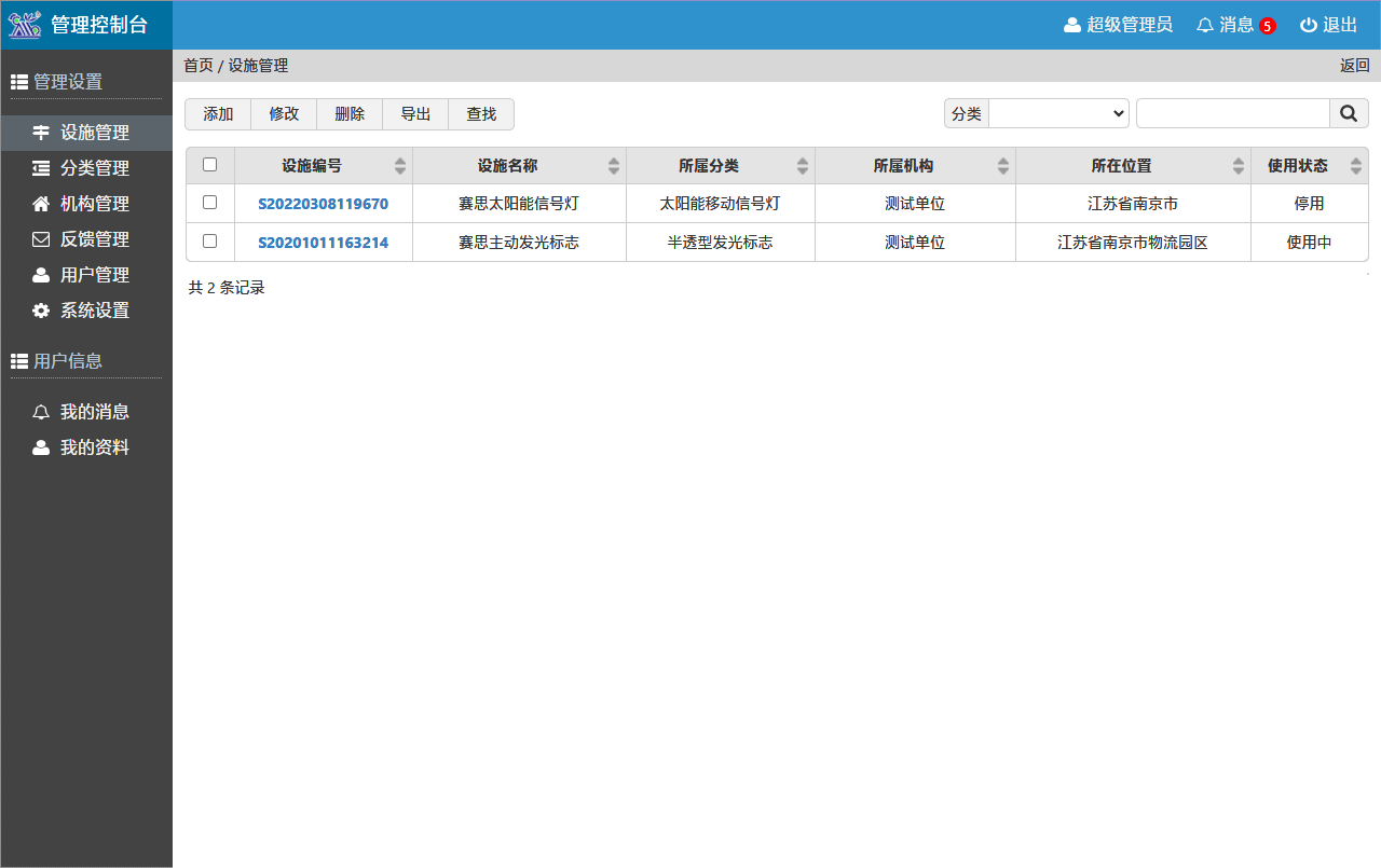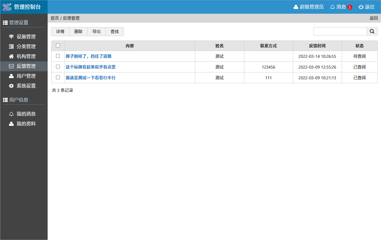 設(shè)施管理系統(tǒng)擁有完善的后臺(tái)管理功能,可按列表添加設(shè)施設(shè)備,可按層級(jí)添加分類、機(jī)構(gòu)??梢蕴砑佣鄠€(gè)管理用戶,并設(shè)置不同管理權(quán)限。當(dāng)收到反饋信息后,能及時(shí)顯示新消息數(shù)量。在反饋管理模塊中,可查看當(dāng)前反饋的信息列表,及時(shí)處理對(duì)應(yīng)問(wèn)題。
