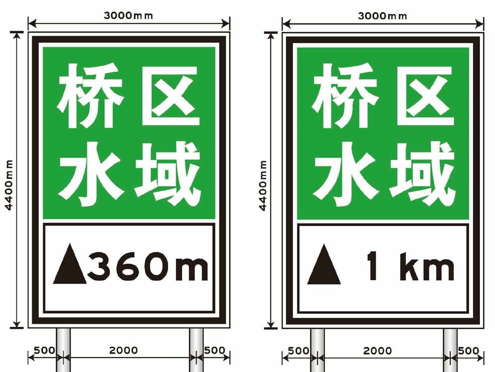 “橋區(qū)水域”航道指示標(biāo)志,設(shè)置于河道兩岸合適位置,主要用于告知通行船舶注意前方橋區(qū)水域的劃定范圍,方便船舶駕駛員能準(zhǔn)確、及時獲取航道水域相關(guān)信息。其版面分上下兩部分:上部,藍(lán)底白字(橋區(qū)水域);下部,白底黑字(三角+距離數(shù)字);整體黑色邊框。版面尺寸通常為:3000mm *4400mm。通常采用雙立柱安裝方式。如下圖所示: