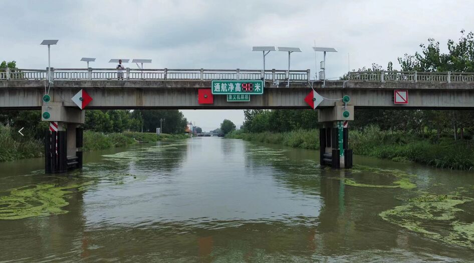 3、數(shù)據(jù)檢測:配置水位檢測雷達裝置,實施檢測水面凈空數(shù)值,疊加安全富裕高度數(shù)值,采用微控算法程序,實時向標志版面?zhèn)鬟f凈空數(shù)值,動態(tài)顯示。如下圖: