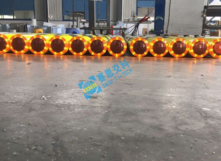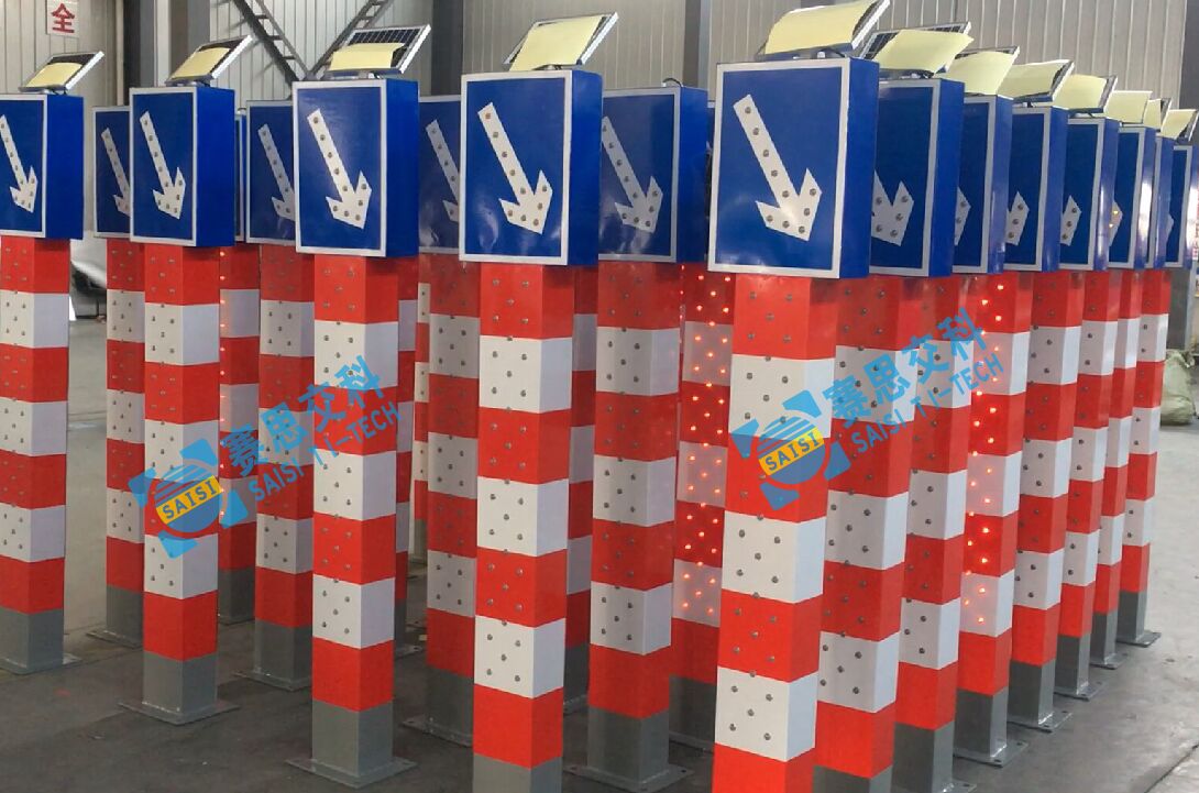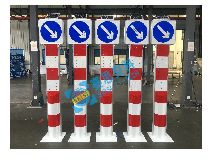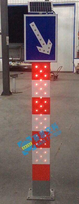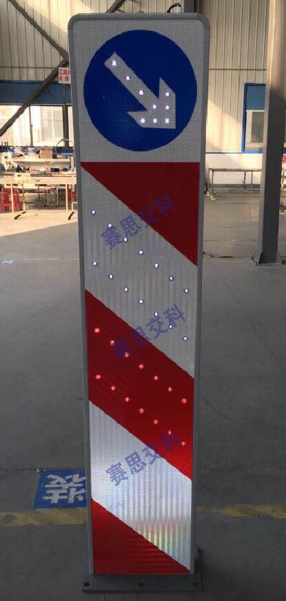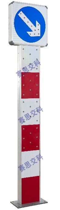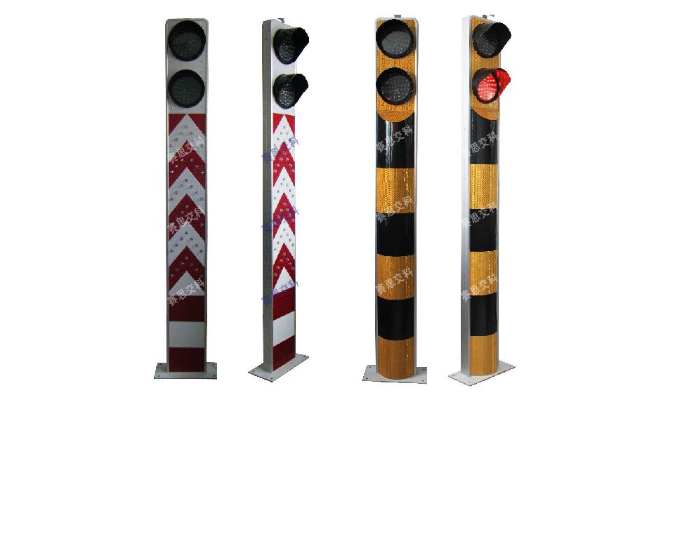 2、基本說明:采用一體式柱體結構,標志版面圖案中嵌入LED發(fā)光管,柱體上設置警示發(fā)光管,采用太陽能蓄電池供電,設置于中央隔離帶端口。