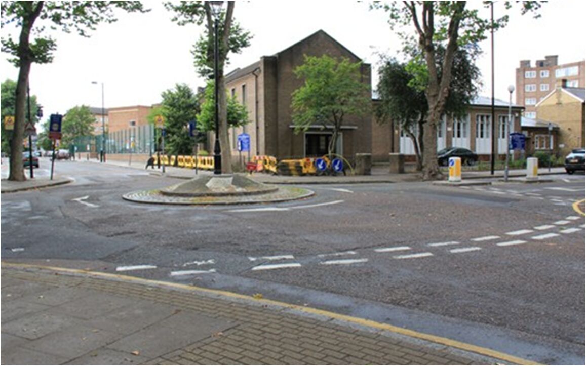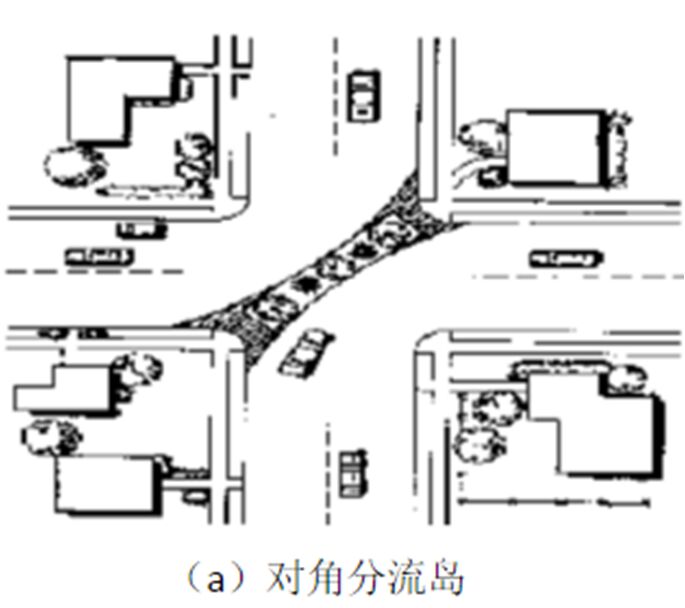 對(duì)角分流島是設(shè)置在交叉口對(duì)角線上的障礙物,以阻斷直行車流。其優(yōu)點(diǎn)是:不需要封閉街道,只需要改變現(xiàn)有街道的方向;能保證行人和自行車通行。缺點(diǎn)是:需要重新改造拐彎處的路緣,造價(jià)可能比較高;內(nèi)部和救援車有時(shí)需要繞行。