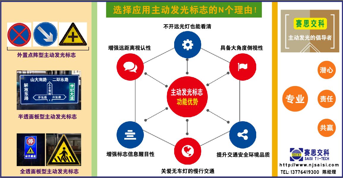 南京賽思交通信息科技有限公司,是一家專業(yè)從事交通安全研究、創(chuàng)新型交安設(shè)施研發(fā)的科技型公司,我公司研發(fā)、生產(chǎn)、銷售的主動(dòng)發(fā)光標(biāo)志系列產(chǎn)品,已在全國各地的交通安全工程中廣泛使用,并在交通穩(wěn)靜化的提示、警示、管理方面取得了良好的功能效果,更多了解交通安全技術(shù)方案、創(chuàng)新交通安全產(chǎn)品,可登錄本網(wǎng)站www.4yfotyk.cn查閱,或致電:陳經(jīng)理,13776419300。
