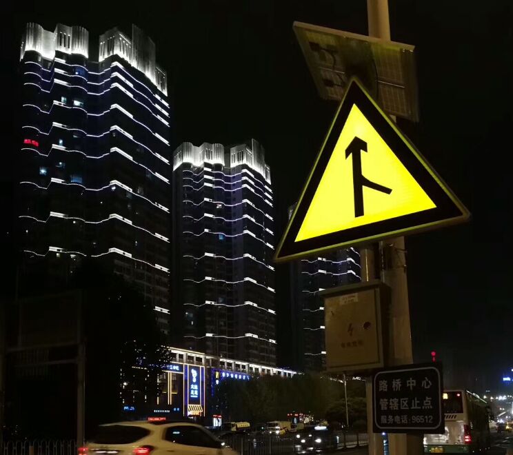 標(biāo)志版面整體發(fā)光,對(duì)于禁令、警告類(lèi)有紅、黃、黑等深色系列反光膜的,能通過(guò)版面中的白色透光膜來(lái)反襯圖案,標(biāo)志整體發(fā)光面柔和,適合亮化、景觀等暗環(huán)境中的發(fā)光點(diǎn)綴。